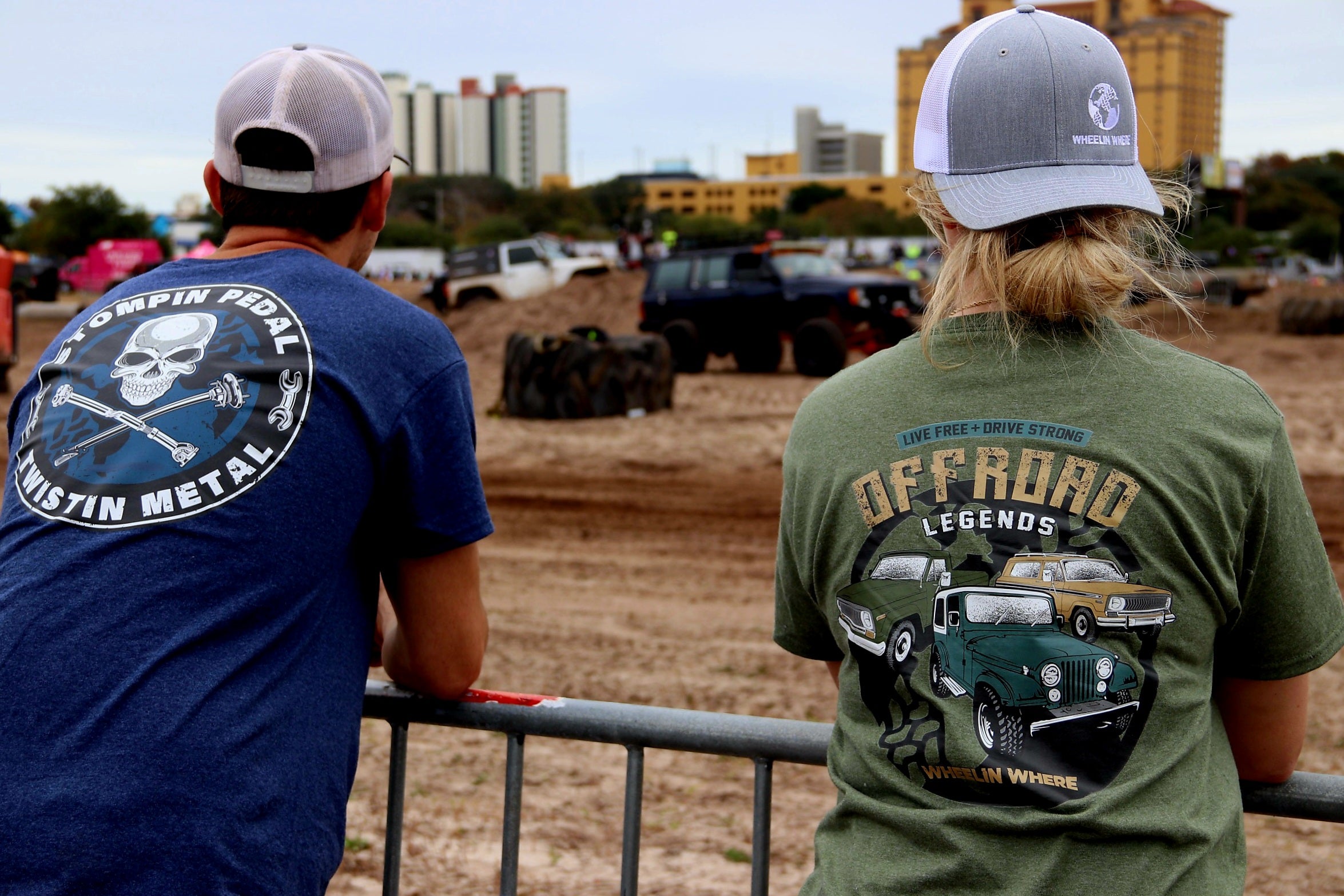 Wheelin' Where is an apparel company founded specifically to put clothes on the backs of those that live this lifestyle. Folks with a free wheelin', devil-may-care attitude that want to look good whether they are muddn' through the marshland, letting a little air out to scale a dune or rolling down Main Street on the way to the car wash after a hard day off-road.